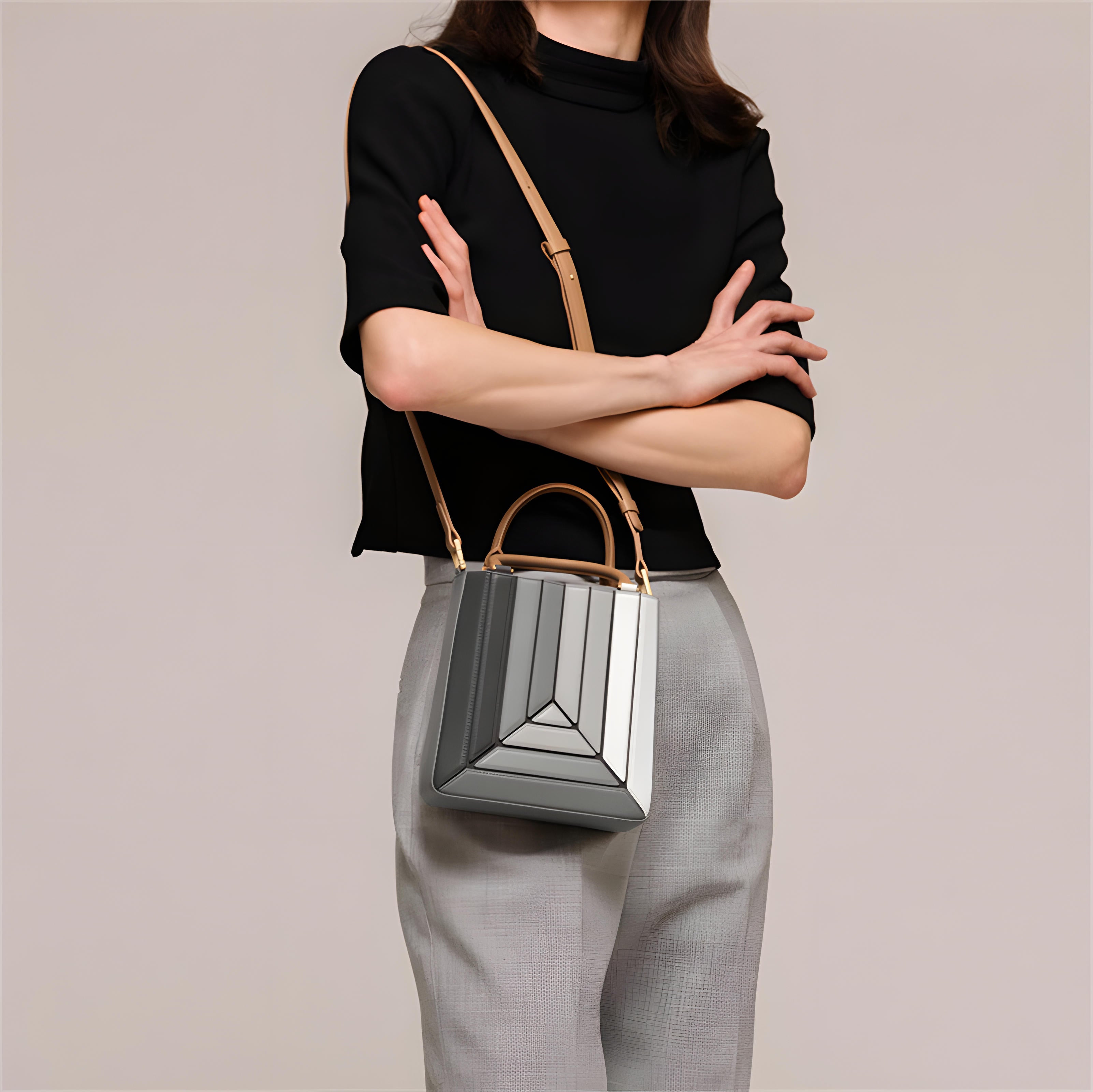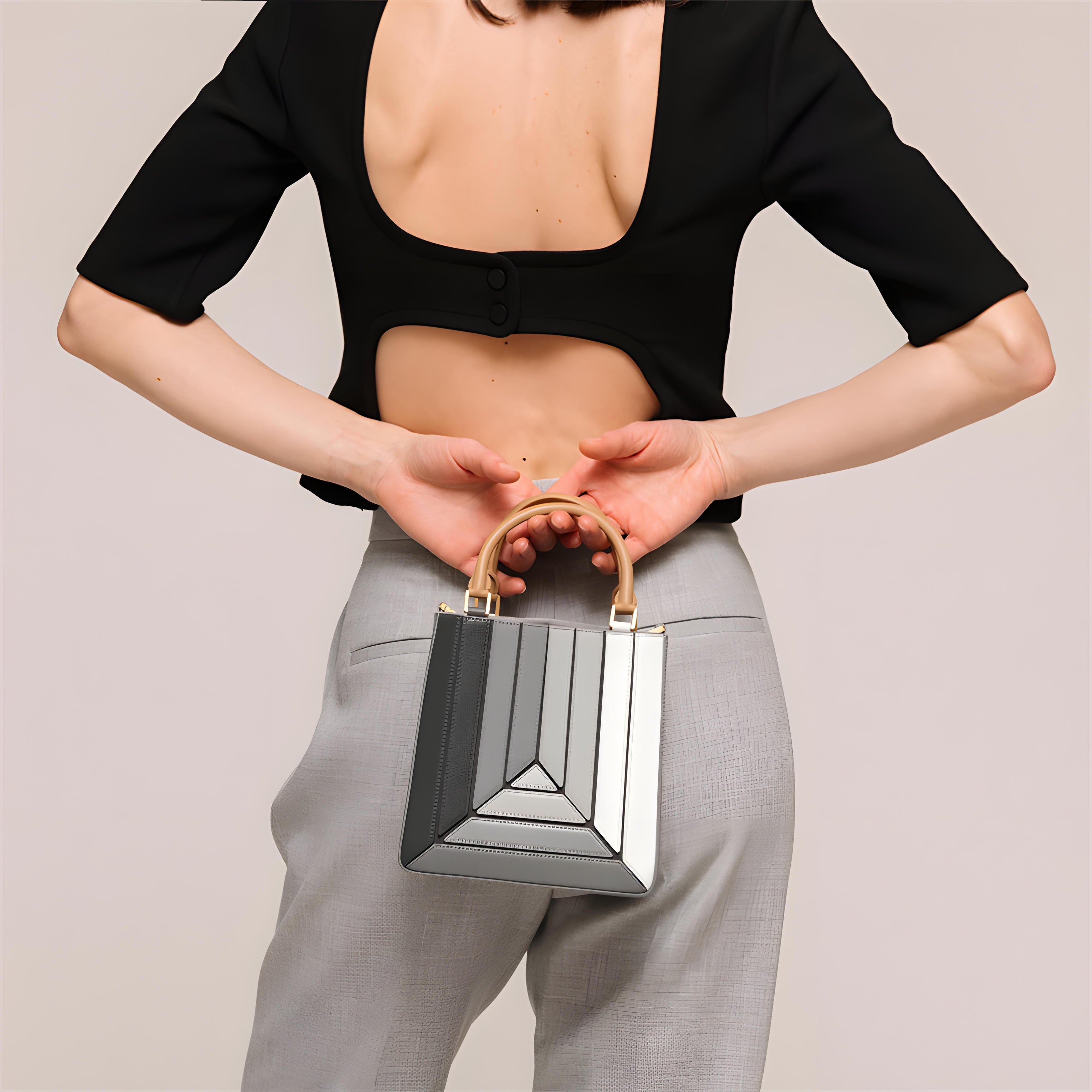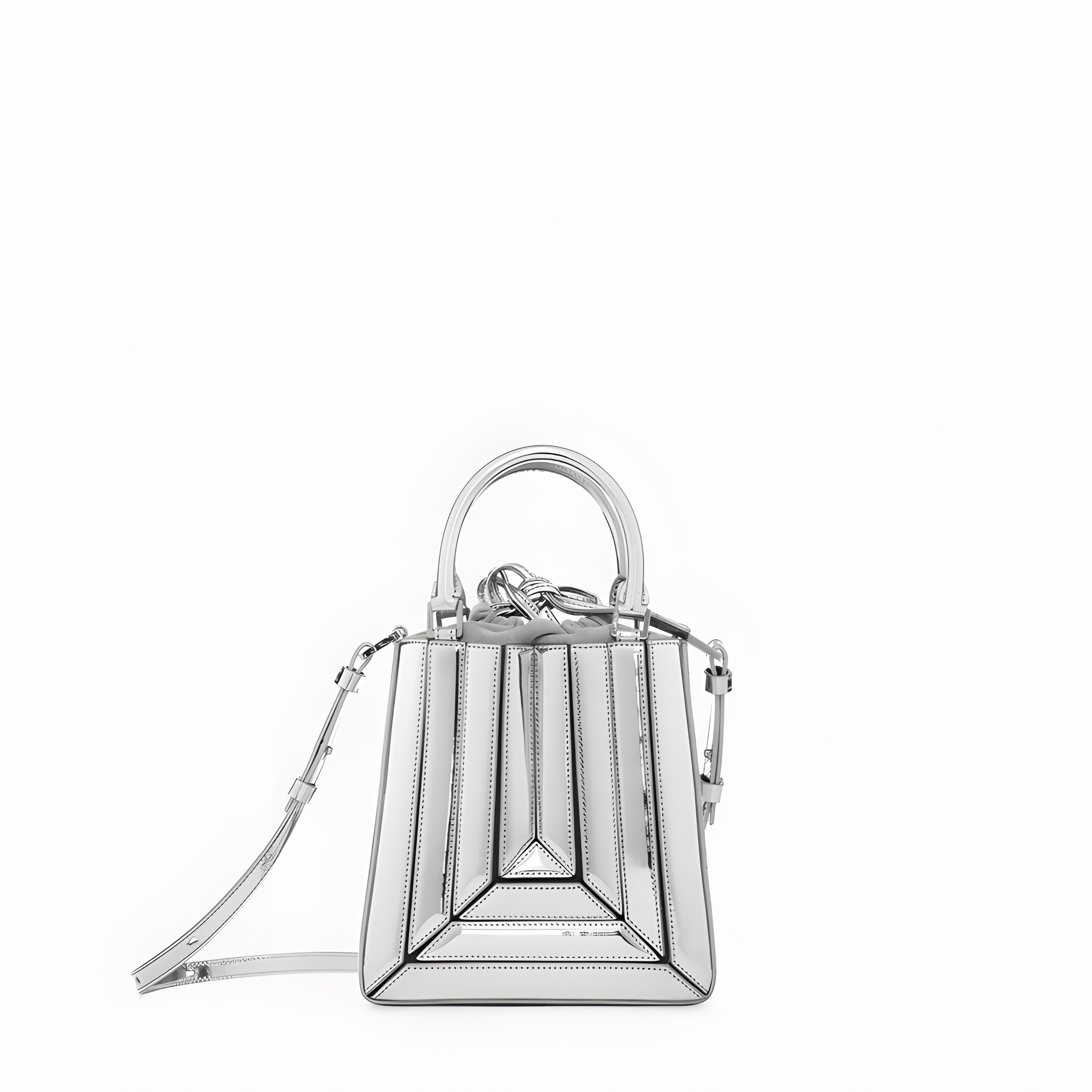 Its exterior design is a surrealist dream, reminiscent of a maze-like structure protruding outwards, with sharp, clean lines, and a 3D façade. It has a suede drawstring top, securing your belongings on the go.