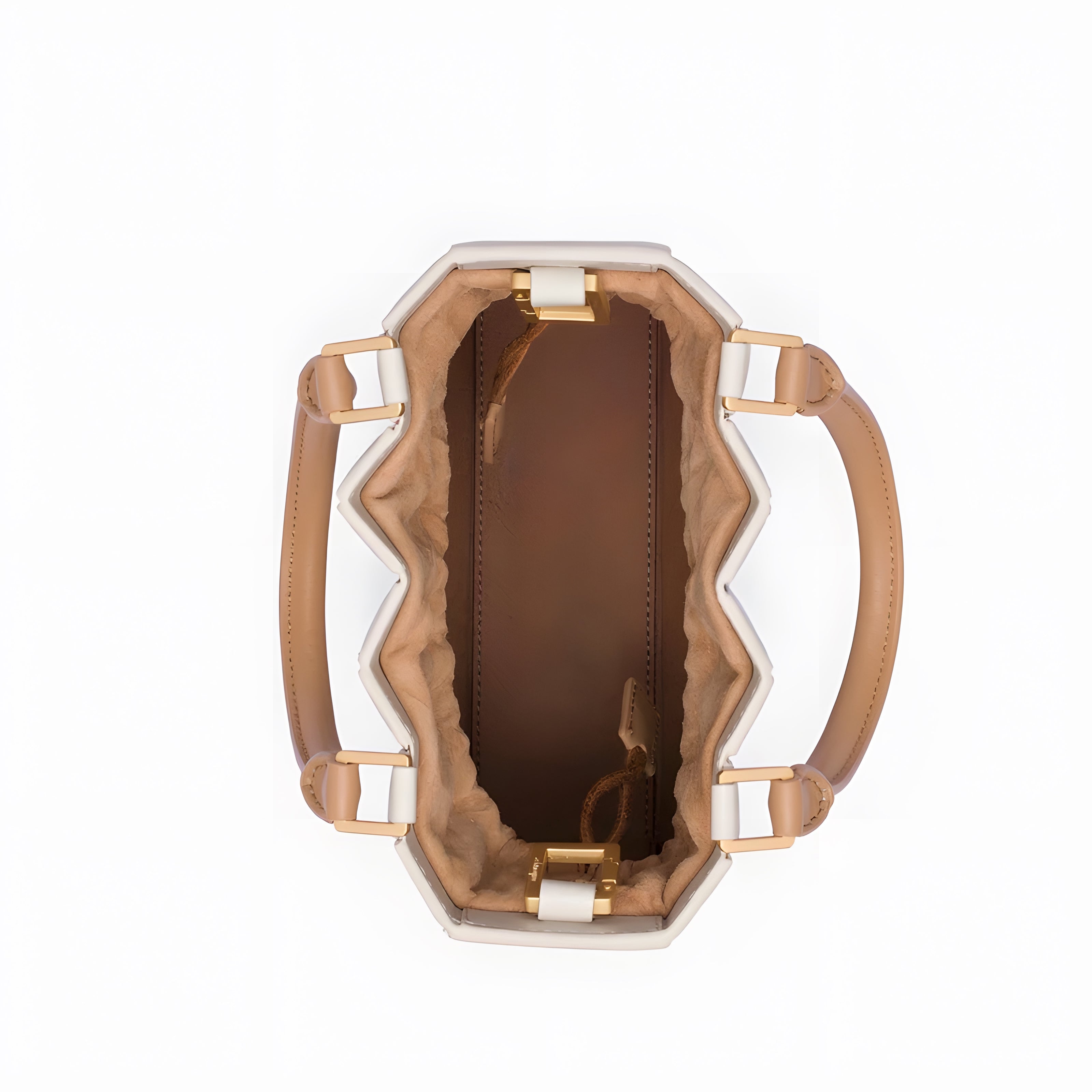 Its exterior design is a surrealist dream, reminiscent of a maze-like structure protruding outwards, with sharp, clean lines, and a 3D façade. It has a suede drawstring top, securing your belongings on the go.