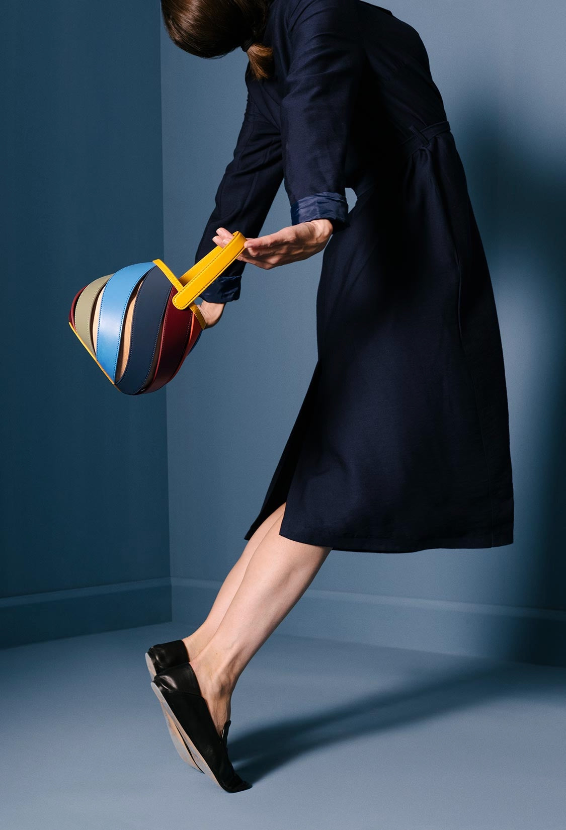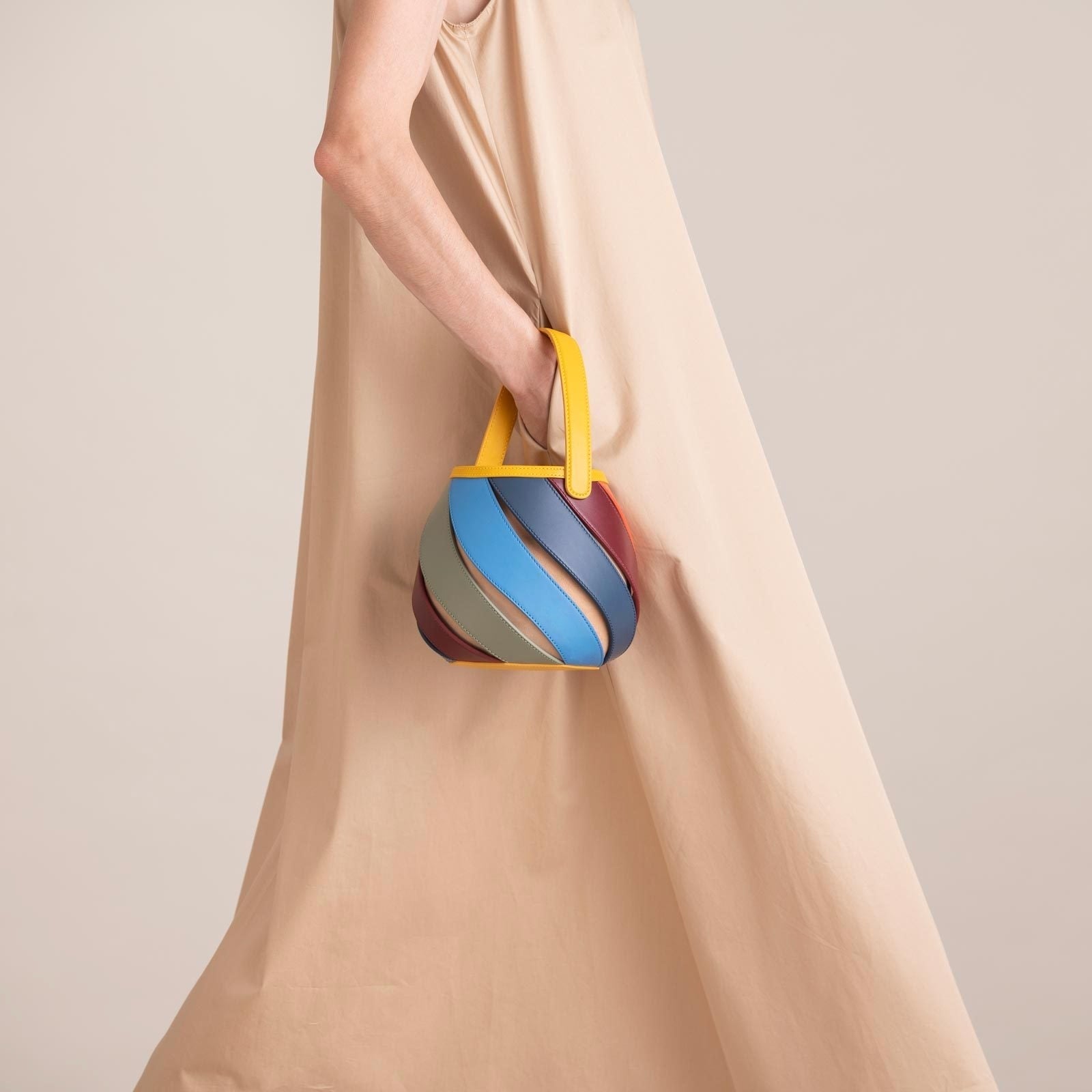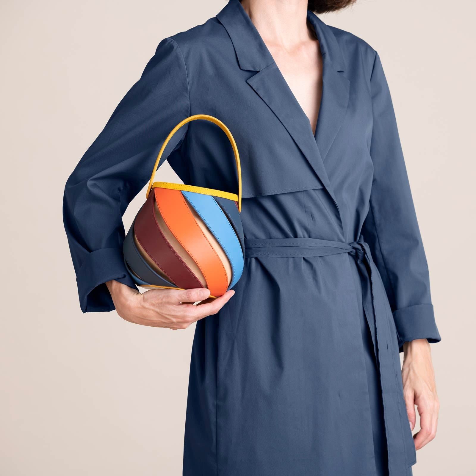 The Bag features a unique wind spinner silhouette. Crafted from smooth leather, it boasts a cleverly designed top handle linked through a hidden joint, allowing it to elegantly fall when using the shoulder strap. A luxurious suede drawstring top ensures your belongings are kept safe and stylishly stowed.